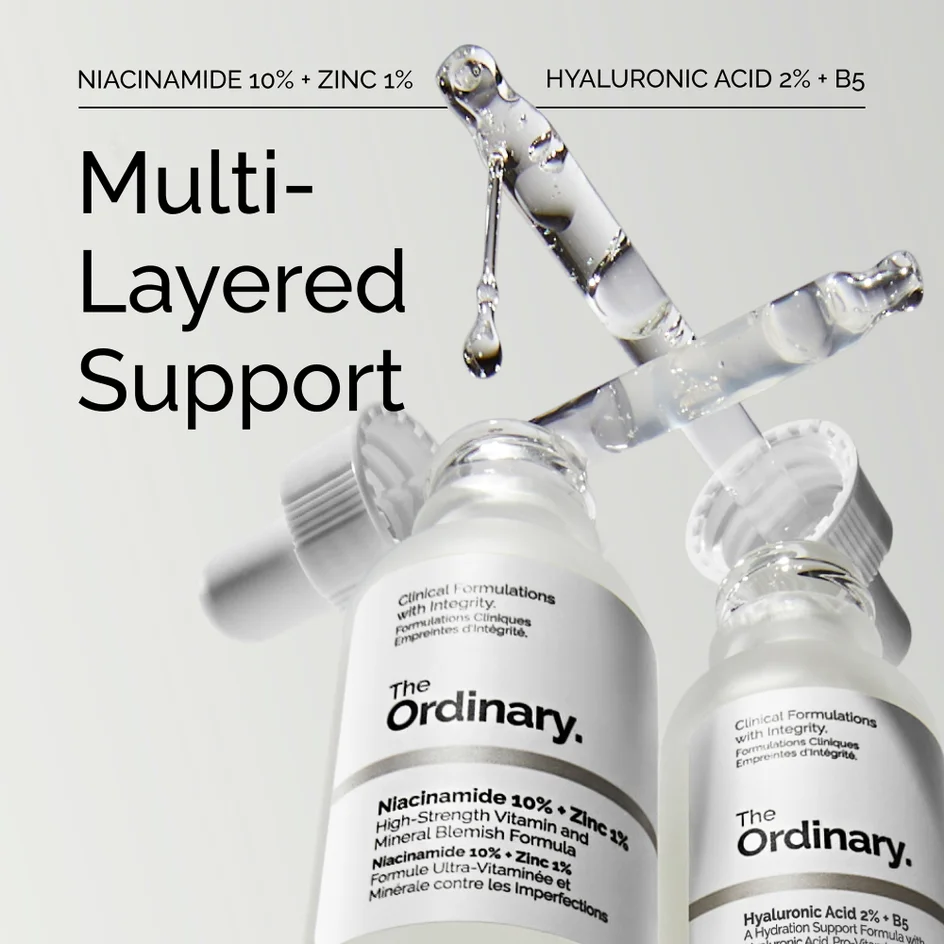 - تجمع هذه المجموعة بين سيروم الهيالورونيك أسيد للترطيب العميق وسيروم النياسيناميد مع الزنك لتنظيم الإفرازات الدهنية، ليعملا معًا على إعادة التوازن الطبيعي للبشرة وتحسين ملمسها ومظهرها اليومي.